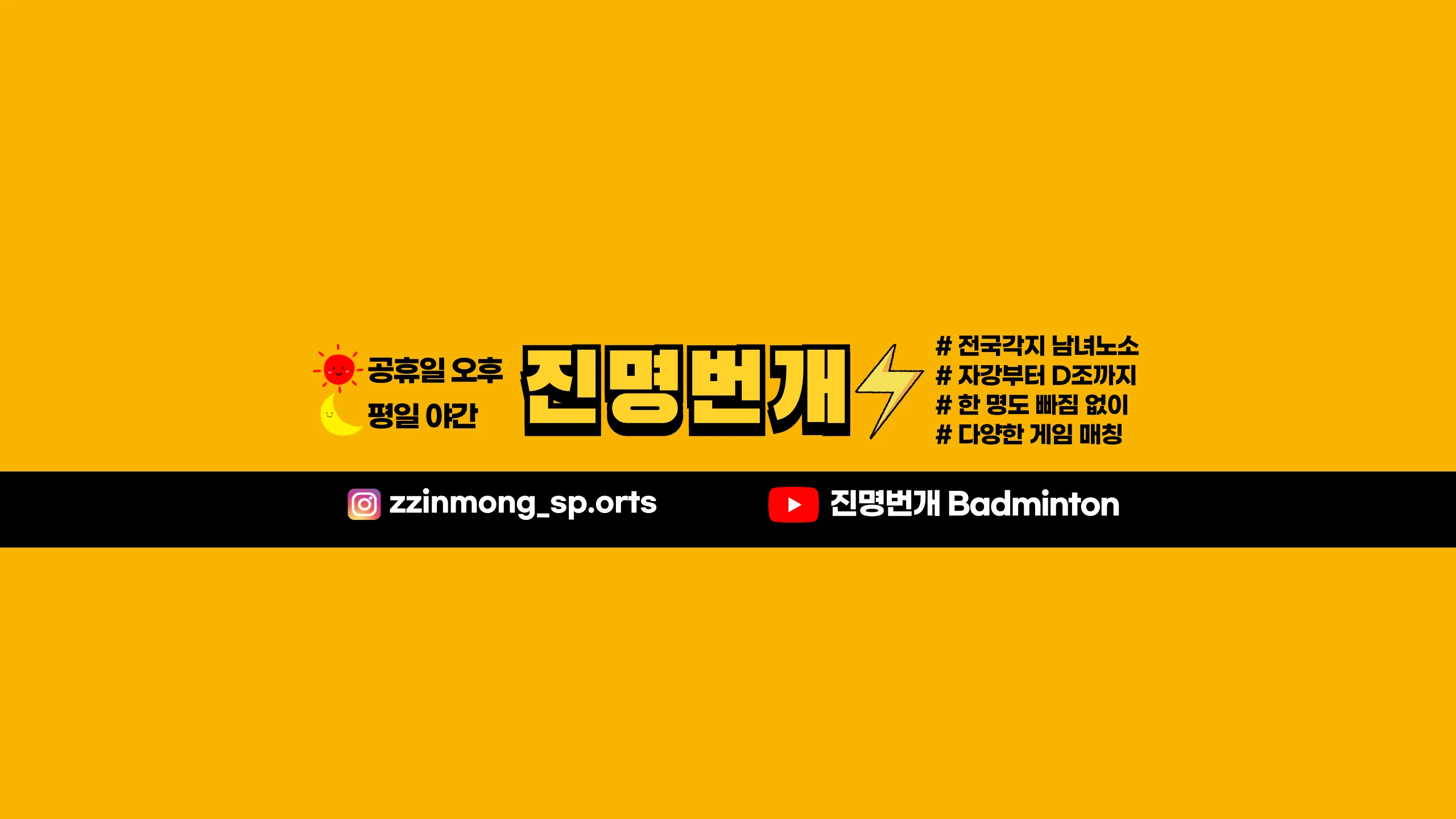 ⚡️진명번개⚡️참가 신청 프로필 링크 ! ◾️WHAT? 영남권에서 가장 핫한 배드민턴 번개 ◾️WHO? 전국 각지의 자강부터 D조까지 누구나 자유롭게 참여 ◾️WHEN? 공휴일 오후 / 평일 야간 ◾️WHERE? 부산 배드민턴 센터 ◾️WHY? 급수 / 나이 상관 없이 모두가 어울려 행복민턴치기 위해 ◾️HOW? 주인장 이진명이 직접 한 명도 빠짐없이 다양한 게임 매칭 📺채널소개📺 ❤️진명번개 현장스케치 : 대회, 모임, 행사 등 다양한 현장의 VLOG 🧡배드민턴대회 : 배드민턴대회 영상 💛진명번개 PLAY : 진명번개에서 함께 땀 흘리는 모두를 담는 경기 영상 💚레슨 영상 : 배드민턴 꿀팁 / 실력 성장을 위한 노력 에피소드 💙제품리뷰 : 배드민턴 용품에 대한 상세하고 솔직한 후기 🤎라떼민턴 : 부산 엘리트선수출신 2040 배드민턴 팀 '리셋‘ 🤍진명소개🤍 저는 [진심, 그리고 열정] 으로 살아가는 사람입니다. 20살에 처음 학교